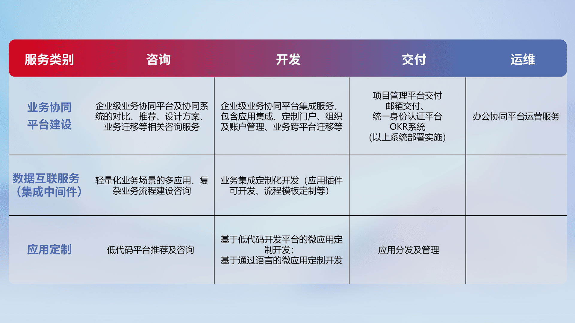 针对钉钉、、、、企微、、、、IDaas等平台级产品提供产品的规划、、、、方案、、交付、、、、定制化开发等服务,,实现如统一协同办公、、、智能客户服务、、混合会议管理、、智能数据查询、、、、等业务场景,,实现数字化转型。。